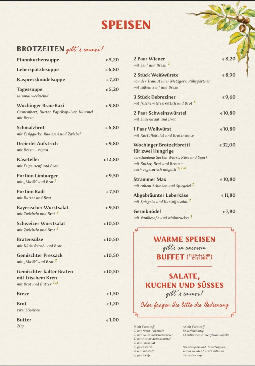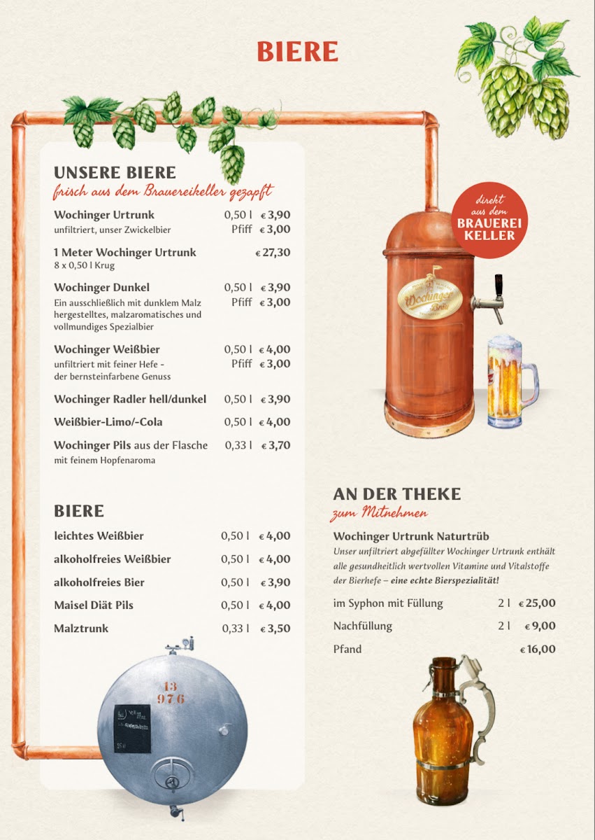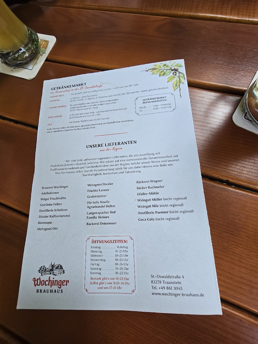 At the heart of Traunstein, nestled along St.-Oswald-Straße 4, Wochinger Brauhaus Menu offers a delightful escape for lovers of hearty, traditional German fare. Whether you’re here to unwind after a day of exploring or simply to enjoy a great meal, the menu caters to every taste. You’ll find a variety of flavors, from classic sausages and schnitzels to innovative twists on local favorites, all served with a touch of Bavarian charm. Pair your dish with one of their expertly brewed beers, each crafted with care and tradition. The atmosphere is laid-back, making it the perfect spot to savor authentic German cuisine in a welcoming setting.